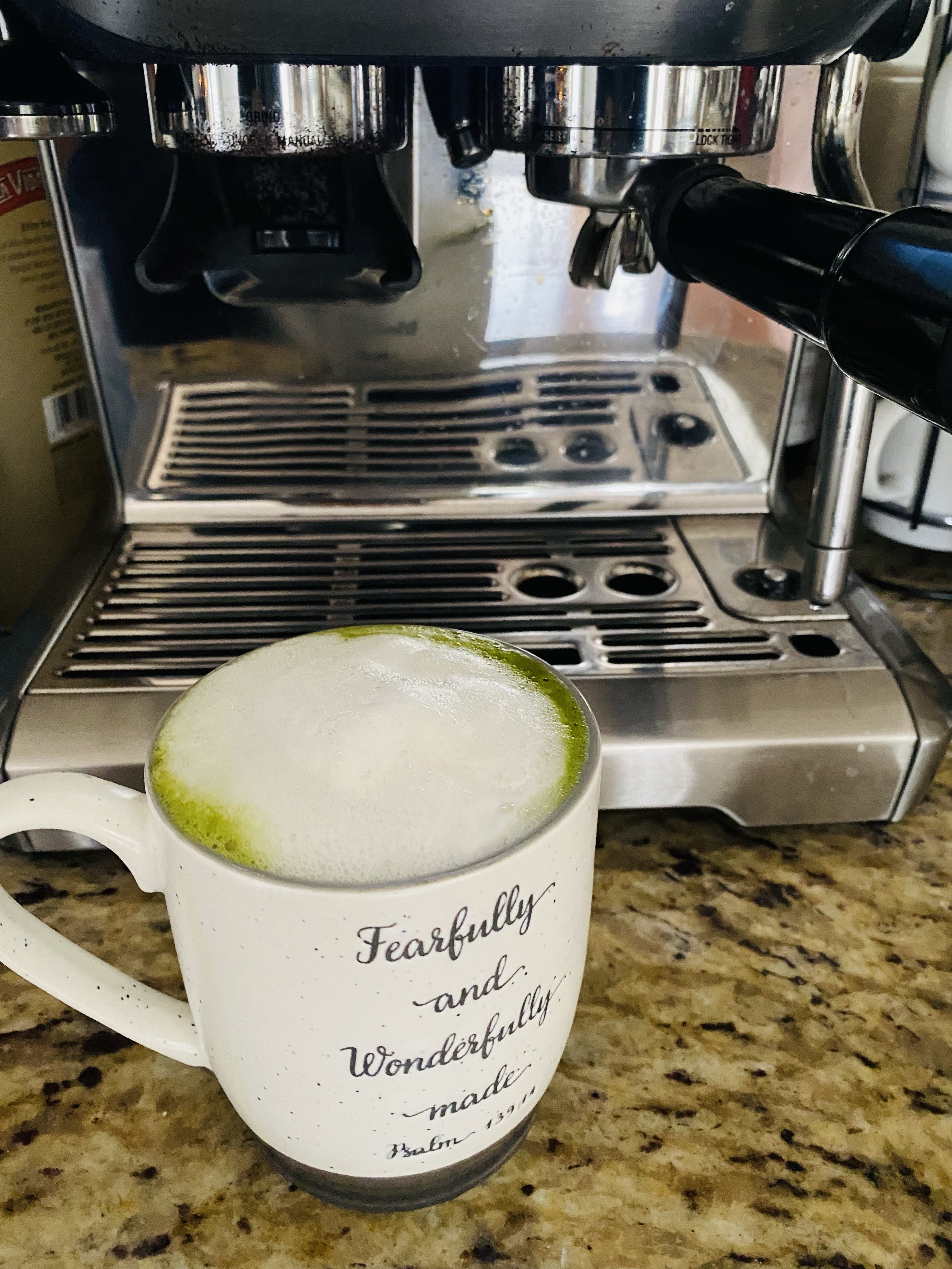 Add 1 teaspoon of matcha to a large mug (important because if you are using an immersion blender the mug needs to be taller and wider so as not to make a mess like I did the first time), then add 1/2 cup of hot water, add about a tablespoon of honey, and then use the immersion blender or bamboo whisk, or milk frother to mix. I add my honey here because I like it mixed in properly with the blender, some may disagree but do you. Then I use my milk steamer on my coffee machine to froth about a 1/4 cup of oat milk (your preference on the amount and type of milk). Pour it into the tea. Voila, matcha tea latte. Should be smooth and delicious!